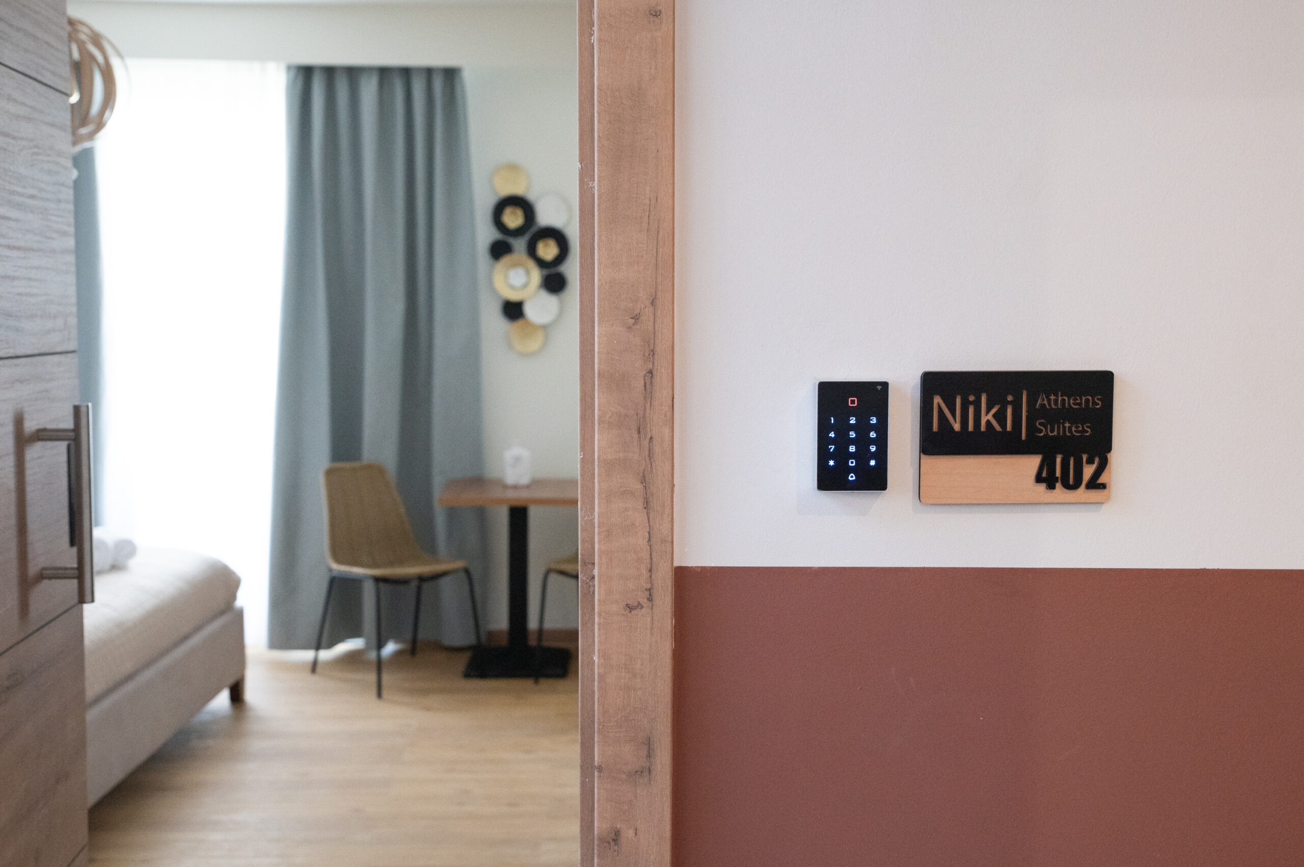 Modern Comforts: Niki Athens Suites – 402 – Urban Suite at Historical Centre Monastiraki, offers a recently renovated apartment with free WiFi, air-conditioning, and a fully equipped kitchen. The property includes a dining table, sofa bed, and parquet floors.
